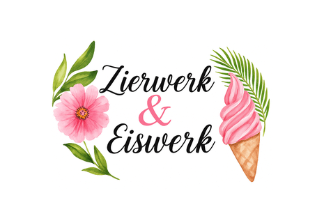 2 kugeln joghurt- und 2 kugeln erdbeereis, sahne, erdbeersoße, schokotopping